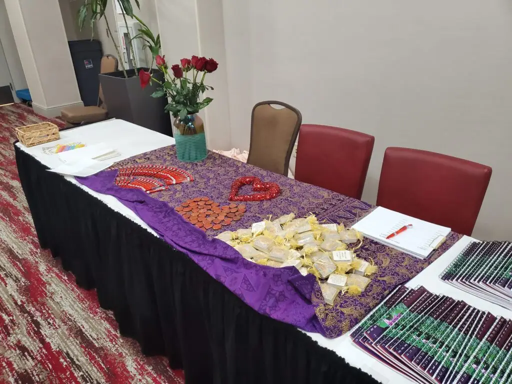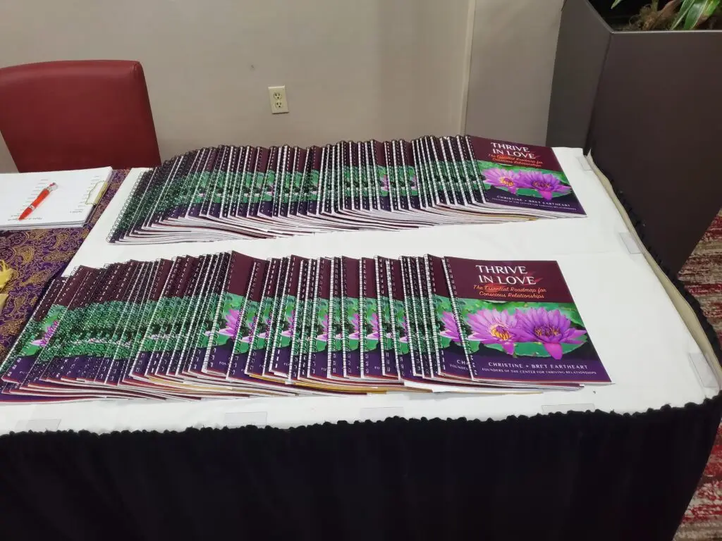 I flew in on Friday and it was a long day. Upon setup I recieved a great set of love socks from Christine. The room tooks us about 2 hours to setup. There was a lot of care and thought put in to arranging the chairs and spacing. The workbook was amazing and on the entry table we had stone hearts and some friends decks.